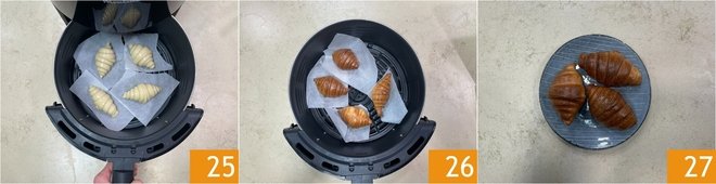 Then place them inside the basket of the air fryer (we used an air fryer with a 6-liter capacity) 25 and store the others in the fridge. Cook the brioche in the air fryer at 302°F for 13 minutes. Then remove them 26 and continue cooking the others, brushing them one at a time, and then serve 27.