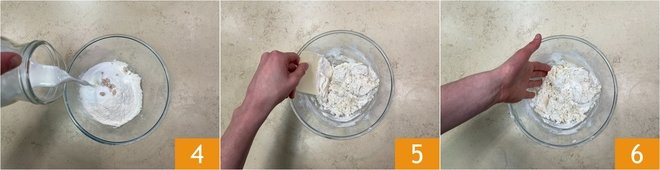 Add the milk 4 and mix the ingredients with a dough scraper 5, then knead with your hands 6.