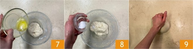 When the ingredients are well combined, add the butter at room temperature 7 and continue kneading in the bowl until absorbed. Finally, add the salt 8 and knead again. Transfer the dough to a work surface and knead it for about 10 minutes 9 until smooth.