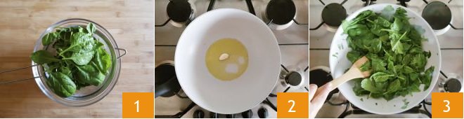 To make the mini lentil gateau, first wash and drain the spinach 1. In a large pan, heat the oil and fry a whole clove of garlic 2. Add the damp spinach 3, salt, and cook for about 5 minutes, moving them with a wooden spoon.