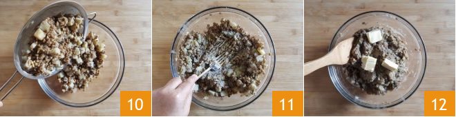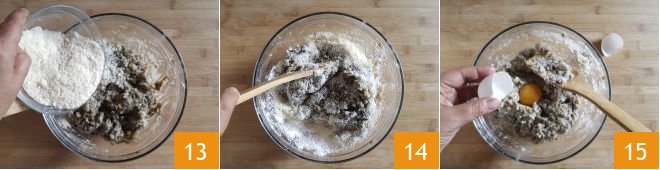 Also, add the grated cheese 13, mix again 14, and then incorporate the egg 15.