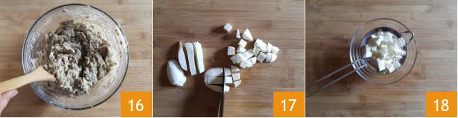 Lightly pepper and mix well 16. Cut the mozzarella into cubes 17 and place them in a sieve to drain excess liquid 18.