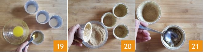 Butter 8 disposable aluminum molds with 2 teaspoons of melted butter using a kitchen brush 19 and sprinkle with breadcrumbs 20. Fill each mold halfway with the potato and lentil puree 21.