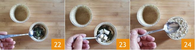 Add a little cooked spinach 22 and continue with 4 or 5 mozzarella cubes 23. Finally, cover with the lentil and potato mixture, pressing with the back of the spoon 24.