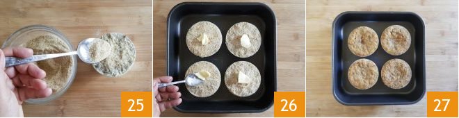 Sprinkle with plenty of breadcrumbs 25. Place a small piece of butter on top 26 and bake on the middle rack of the preheated oven at 355°F in static mode for about 30 minutes. Remove the well-golden cakes from the oven 27, unmold, and serve them hot.