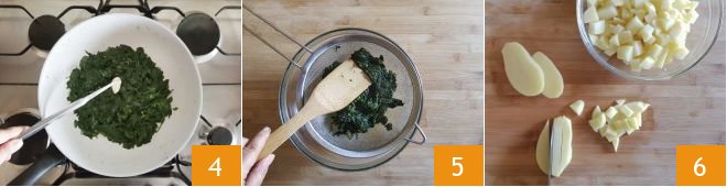 Finally, remove from heat, discard the garlic 4, and drain with a sieve 5. Peel the potatoes and cut them into cubes 6.