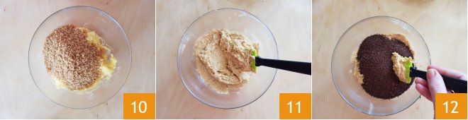 Add the chopped hazelnuts 10 and mix with a spatula 11. Add the grated chocolate 12