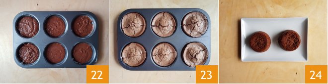 and fill them with the batter 22. Bake at 356°F for about 20 minutes. Once the mini caprese cakes are baked, remove from the oven 23 and let them cool completely before removing them from the mold. Transfer to a small plate 24