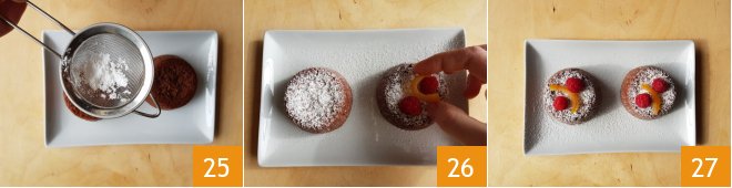and decorate with powdered sugar 25, raspberries, and orange zest 26. Your mini hazelnut caprese cakes are ready to be served 27!