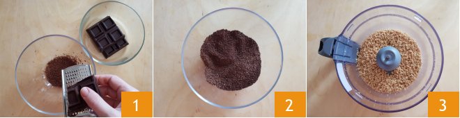 First, grate the chocolate 1 and set it aside 2. Place the hazelnuts in a blender and blend them 3.