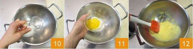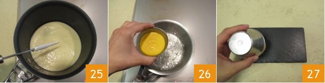 Meanwhile, prepare the crème anglaise: pour the cream into a mixing bowl 10, add the egg yolks 11 and cook it in a bain-marie, stirring continuously with a spatula 12, until it reaches 185°F.