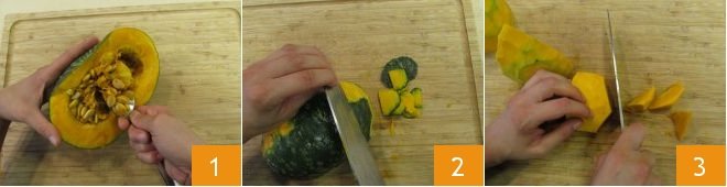 To prepare the mini pumpkin bavarois with Parmesan sauce, first clean the pumpkin by removing the seeds 1 and the skin 2. Then cut it into chunks 3,