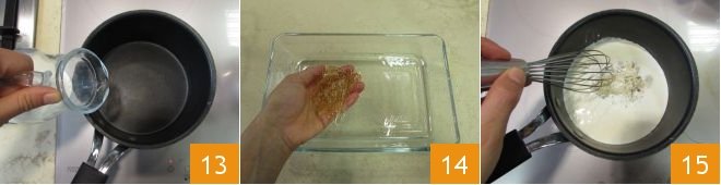 Pour the milk into a saucepan 13 and heat it. Then gently squeeze the gelatin 14 and dissolve it in the milk 15.