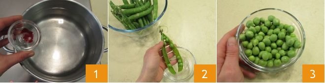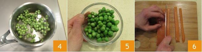 then cook them in slightly salted boiling water 4 for about 10 minutes so they remain crispy. Set aside the cooked peas 5 and place a pot full of water on the stove to cook the pasta, color the water with saffron 5. Take care of the salmon: first cut the fillet into strips 6