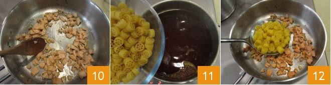 just until they become pink 10. Meanwhile, cook the pasta in the saffron-flavored water 11 for about 6 minutes or the time indicated on the package. Once ready, drain the pasta directly into the pan with the salmon 12.