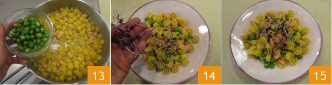 Add the peas 13, mix to season, and then serve on plates garnishing with beet sprouts 14. Your mini saffron and salmon wheels are ready to be enjoyed 15.