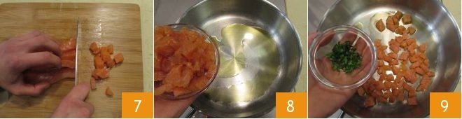 and then into cubes 7. Heat the oil in a pan, add the salmon cubes 8, salt them, season with parsley 9, and sear them for just a few moments,