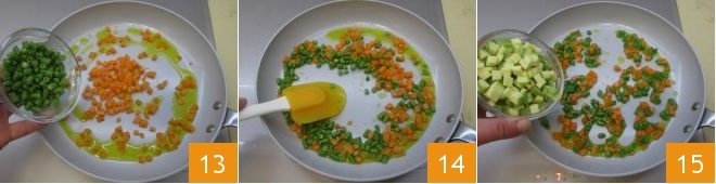 In a non-stick pan drizzled with olive oil, cook the carrots and green beans 13 and, over moderate heat, sauté them 14. Now add the zucchini 15