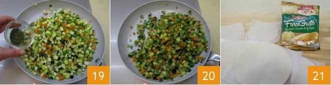 add the chopped herbs 19 and cook for 10 minutes, keeping the vegetables at rest once cooked 20. Take the dough discs from the package and remove the paper they rest on 21.