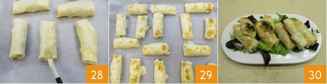 Once you have made the 16 mini strudels, place them on a baking sheet lined with parchment paper and brush the surface with beaten egg 28. Bake in a preheated static oven at 392°F for 10 minutes (if using a fan oven, 356°F for 8 minutes): they should be lightly golden 29. The mini stringy strudels with vegetables are ready 30: serve them piping hot.