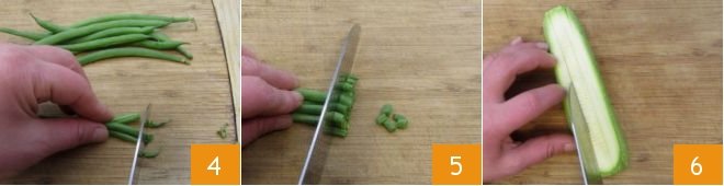 Continue with the green beans: remove the ends from these as well 4 and cut them into small rounds 5. Trim the zucchini and slice them lengthwise, reducing each slice into sticks 6.