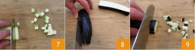 Dice these as well 7. Finally, the eggplants: remove the ends and, like the zucchini, slice them lengthwise, reduce the slices into sticks 8, and dice them 9.