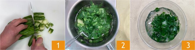 To prepare the mini strudels with chard, ricotta, and speck, first start with the filling: wash the chard and cut it into pieces 1. Boil for 5 minutes in salted water, then drain 2 and cool in ice water 3.