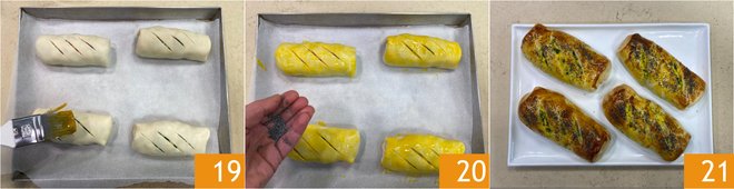 Place the mini strudels on a baking sheet lined with parchment paper and brush the surface with the beaten egg yolk 19, then sprinkle with poppy seeds 20. Bake in a preheated static oven at 392°F for 20-25 minutes or until the pastry is crispy and golden. Take out of the oven and let the mini strudels with chard, ricotta, and speck cool for a few minutes before serving 21!