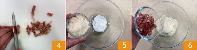 Cut the speck into strips 4. In a bowl, place the ricotta, then add the Parmesan 5 and the speck 6.