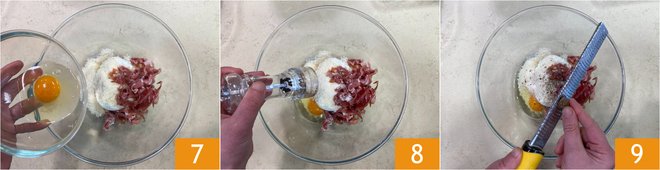 Add the egg 7 and season with salt, pepper 8, and a pinch of nutmeg 9.