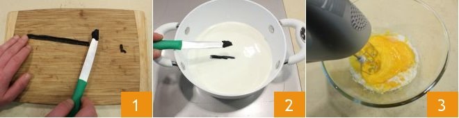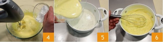 When they are white and frothy, add the sifted cornstarch 4 or rice starch and mix it with the rest of the mixture. Remove the vanilla pod from the heated milk and cream and add the egg mixture 5. Turn on the low heat again and stir continuously with a whisk to thicken the mixture 6.