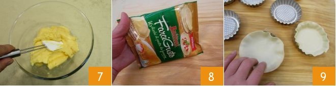 Press the bottom and sides well and prick the bottom with a fork 10; brush the discs with the yolk beaten with milk 11, then bake them in a preheated static oven at 392°F for 10 minutes (356°F for 5 minutes if using a fan oven; in this case, you can bake one to adjust for the others). Once baked, take them out 12 and let them cool slightly, then unmold them and let them cool completely on a wire rack.
