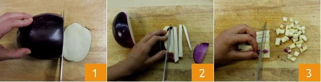 To prepare the mini vegetable and yogurt crumble, start with the vegetables. Wash the eggplant under running water, use a knife to remove the stem, cut it into slices 1, then cut into sticks 2 and finally into regular 0.79-inch cubes 3.