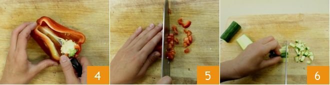 Continue with the peppers: wash them, cut them in half with a knife, and remove the stem and seeds 4. Then cut them into lozenges and then into cubes, also 0.79 inches 5. Proceed with the zucchini: wash it and trim the two ends, then cut it into slices and then into 0.79-inch cubes;