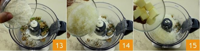 Add the flour gradually 13, the grated Parmesan cheese 14, and the cold butter in pieces 15. Sprinkle with pepper and start the mixer.