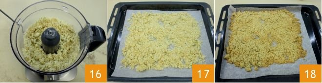 Let the blades run until a sandy mixture is obtained 16. Spread the obtained mixture on a baking tray lined with parchment paper, making sure to spread it over the entire surface 17 and bake in a preheated static oven at 356°F for 10-15 minutes (320°F for 5-10 minutes if using a fan oven). When cooked, the crumble will be golden 18; remove the tray from the oven, let it cool at room temperature.