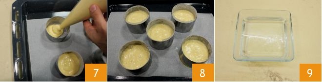 Next, place 5 steel rings with a diameter of about 3 inches and a height of 1.75 inches on a baking sheet lined with parchment paper. Line each ring with a strip of parchment paper about 2 inches high. Then fill each ring about 3/4 full with the whipped mixture (7-8). Bake the sponge cakes in a preheated static oven at 350°F for 35 minutes (or in a convection oven at 310°F for about 25 minutes, checking with a toothpick to see if the inside is dry before removing them). Once ready, remove from the oven and let them cool slightly. Meanwhile, prepare the icing: soak the gelatin sheets in cold water for at least 10 minutes 9.