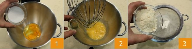 To prepare the mini white almond sacher, start with the sponge cake batter: in the bowl of a stand mixer fitted with beaters (you can also use an electric hand mixer) pour in the eggs and sugar 1, add the honey 2 and begin to mix everything to obtain a light and frothy mixture. Sift the flours 3
