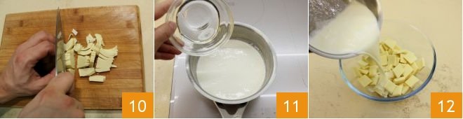 Coarsely chop the chocolate 10 and place it in a bowl, then pour the cream into a saucepan and add the glucose 11, stir and bring to a near boil. Pour the cream over the white chocolate 12 and stir to melt it, then add the well-squeezed gelatin sheets and stir to dissolve completely.