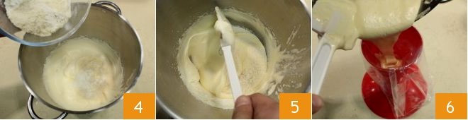 then pour them into the stand mixer 4 and mix with a spatula in an upward motion 5. When well blended, transfer the mixture into a piping bag 6.
