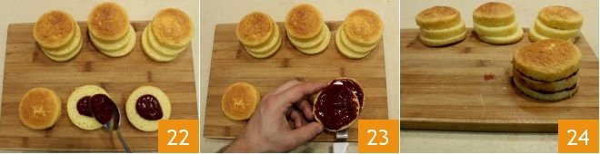 Fill the bottom layer with a spoonful of jam 22, continue with another sponge cake layer and fill it 23; then place another layer to complete the mini cakes 24.