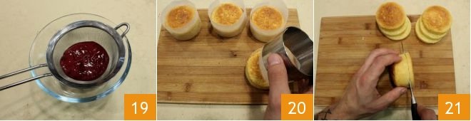 and pass it through a sieve 19. Then take the sponge cakes, remove them from the rings along with the parchment paper 20 and divide them into 3 parts 21 so that each mini cake is made up of three layers.