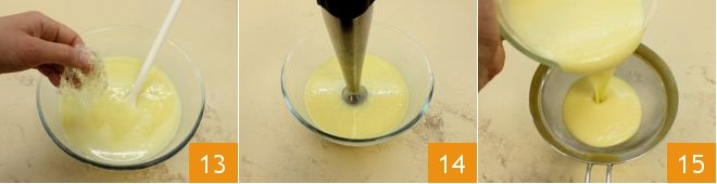 then add the well-squeezed gelatin sheets 13 (you can also proceed in this way: set aside 2 tablespoons of heated cream and dissolve the gelatin in the warm cream before adding it to the rest of the glaze); stir to dissolve completely. Blend with an immersion blender for a few seconds 14 and, if necessary, pass the cream through a sieve to eliminate lumps 15.