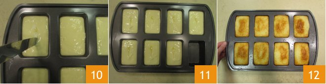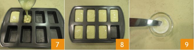 At this point, butter the mini plumcake mold (each space measures approximately 2.3x3.5 inches), pour the mixture with the help of a ladle 7. Fill the spaces 8 and melt the remaining 1 1/2 tablespoons of butter. Dip the tip of a knife (use one with a rounded tip) in the melted butter 9.
