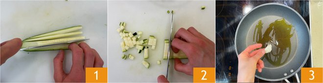 To prepare the mini zucchini and cheese plumcakes, first trim the ends of the zucchini and cut them first into strips 1 and then into cubes of about 0.2 inches 2. In a pan, flavor the oil with a clove of garlic 3.