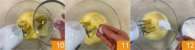 Now slowly pour in the seed oil 10, add a pinch of salt 11 and, lastly, add the flour mixed with the baking powder, one tablespoon at a time 12.