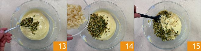 Add the browned zucchini 13 and pecorino 14 to the batter, then mix everything well 15.