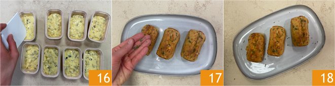 Pour the mixture into 8 4x2 inch muffin cups and score the surface of the plumcakes lengthwise with a dough scraper or the blade of a knife 16: this way you will have uniform growth during baking. Bake in a static oven at 338°F for 45 minutes. Before serving, add a few thyme leaves 17. Your mini zucchini and cheese plumcakes are ready to be enjoyed 18!