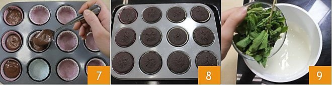 Take a muffin tin lined with cupcake liners and pour the mixture into each liner 7, leaving 0.4 inches of space from the edge. Bake in a preheated static oven at 350°F for 30 minutes 8 (or in a convection oven at 320°F for 25 minutes). Meanwhile, prepare the buttercream: put the water, sugar, and mint sprig in a small saucepan 9.