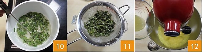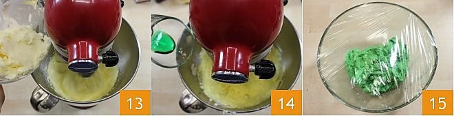 Soften the butter and add it gradually, still beating 13. Finally, add the mint syrup 14. When the buttercream is ready, add the coloring (you can also use powdered or liquid colorants, adding them gradually to the mixture until you achieve the desired color). Mix well to combine. Put it in a bowl covered with plastic wrap 15 and store it in the refrigerator until ready to use.